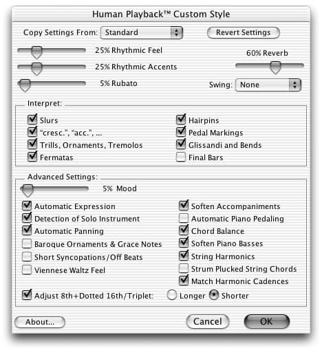 Finale’s Human Playback interprets almost every music notation symbol and text expression you write into a part such as dynamics, articulations, bowing instructions, phrase markings, tremolos, trills, glissandos, phrasing, technical text, genre and style, tempo marks, breath marks and fermatas. It even offers a dialog box where you can personalize how Finale interprets those musical elements.